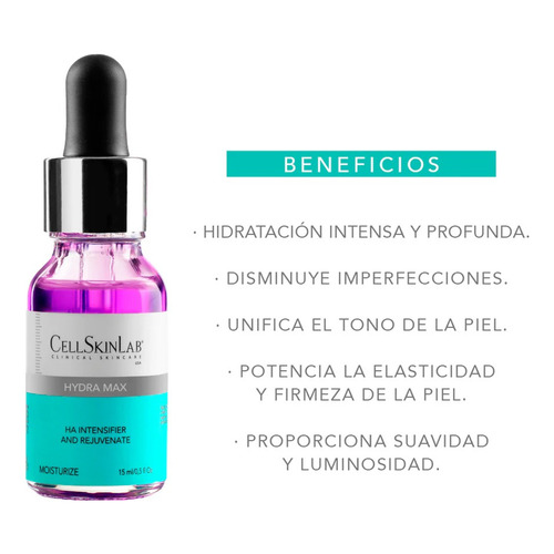 HYDRA MAX, es un potente serum hidratante y corrector de imperfecciones de la piel. Mejora la apariencia, proporciona una piel suave, lisa, rejuvenecida, firme y lozana. Minimiza líneas finas y arrugas producto del envejecimiento prematuro de la piel